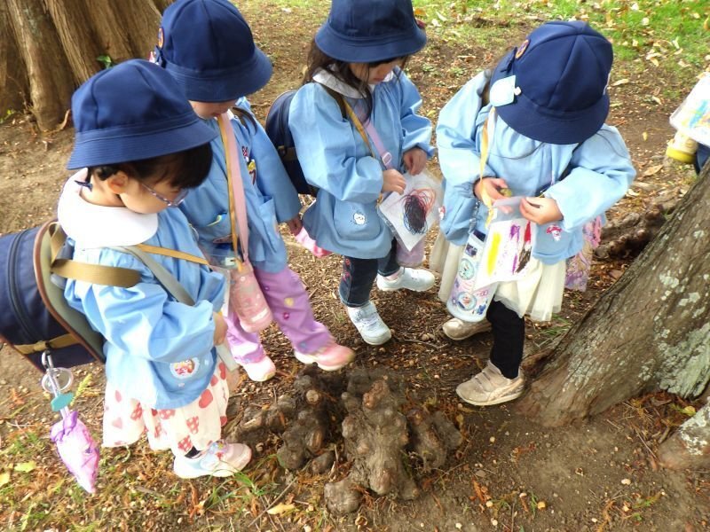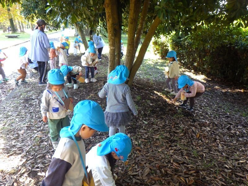 今日は各学年のいくつかのクラスが、幼稚園近くの青戸平和公園へ秋の自然に親しむことを目当てに、ドングリを探しに出かけました。青戸平和公園には、およそ700本の樹木があり、クヌギやマテバシイといったドングリの木も数種類あります。子ども達は、色々なドングリを集めながら、生えているキノコを見つけるなど、秋の自然に触れて、色々な発見や気づきがあったことと思います。このように園の環境だけでなく、地域の環境・資源を活用させていただくことは、子ども達のより豊かな育ちに繋がって行くものと思います。そして、子ども達が地域・地元のよさを知り、子ども達に地元愛を育くんでいく上でも、今後もこうした機会を大切にしていきたいと思っています。