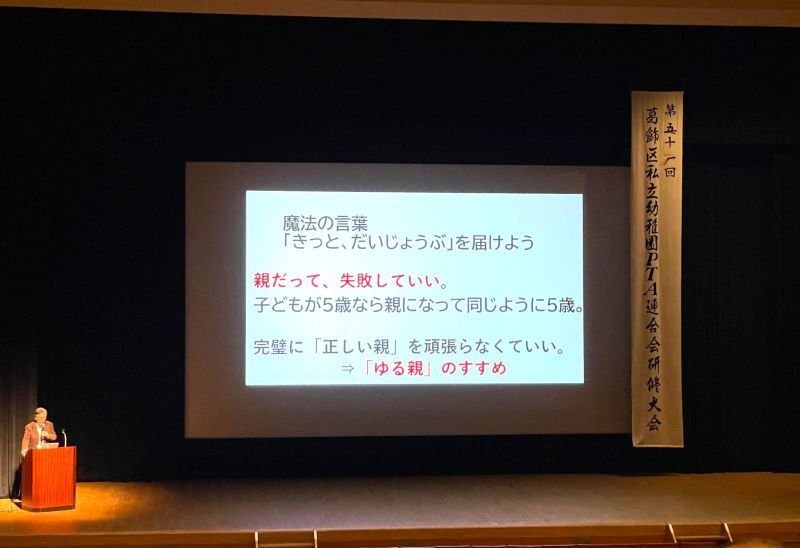 本日は、葛飾区私立幼稚園PTA連合会研修大会が「かつしかシンフォニーヒルズ」にて行われ、区内の私立幼稚園(認定こども園含む)に通う保護者約420名から参加申し込みをいただきました。来賓には、葛飾区長の青木かつのり様や区議会議長の梅沢とよかず様をはじめ、各会派の代表の先生方、子育て支援部の部課長といった皆様にご臨席いただきました。PTA連合会の鈴木会長からは、葛飾区における子育て支援行政へのお礼の言葉と共に、私立幼稚園のよさと教育の大切さについての話がありました。