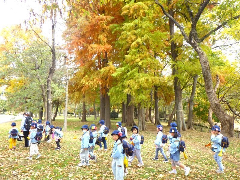今日は年中組の子ども達が、水元公園へ秋の遠足へ出かけました。公園内の木々も赤や黄色に色付き、秋の深まりを感じます。子ども達は園内を散策しながら、ドングリをはじめ、色々な木の実を見つけたり、綺麗な落ち葉を集めたりしながら、秋の自然に触れ、楽しむ様子が見られました。公園内の広場では、先生達と3クラス一緒に鬼遊びをして身体を動かして楽しみました。お弁当はクラス毎に輪になって美味しくいただきました。戸外で食べるお弁当の味は格別ですね。友達や先生と一緒に楽しい食事の時間となりました。子ども達は五感をたくさん使って、秋の自然を感じられたことと思います。これからも身近な自然と関わりながら、子ども達の好奇心や探求心を育んでいきたいと思います。