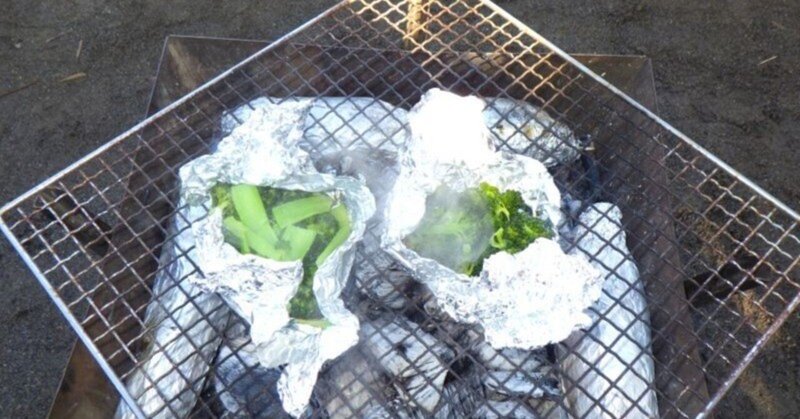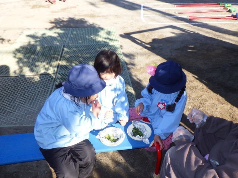 子ども達が本当の火を見たり、煙の匂いなどを感じられる機会として、園庭には焚火コーナーを設けて子ども達と楽しんでいます。焚火の定番の食べ物といえば、焼き芋が思いつきますが、最近では園庭のブロッコリーやカリフラワーが収穫できるくらいに成長しているので、それらを収穫してホイル焼きにして楽しむこともあります。「いい匂いがする!」それらの野菜はサツマイモよりも早く火が通るので、少しするとブロッコリーのよい香りが漂ってきます。収穫から焼くまでの過程を一緒にすることで、野菜が苦手な子でも、「ちょっと食べてみようかな?」という気持ちが沸くようです。これからも機会があれば、他の食材も試しつつ楽しみたいと思います。
