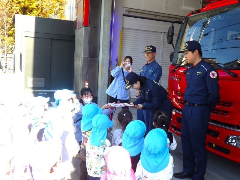 今日は満3歳児クラスつぼみ組の子ども達が、幼稚園の近くにある消防署へ見学に出掛けました。消防隊員の方々へ子ども達が作った消防車の絵を手渡して、消防車や救急車を見学させていただきました。運転席に座らせていただいたり、車内の様子を見せていただくなど、間近で見る消防車や救急車の姿に子ども達も目を輝かせていました。こうした公共の施設を通して、地域の方々と関わりを持つことは、子ども達が地域に親しみを持ち、社会との繋がりを意識する芽生えになると思います。今後も園生活の中で、子ども達が身近な地域や社会と出会える機会を大切にしていきたいと思います。