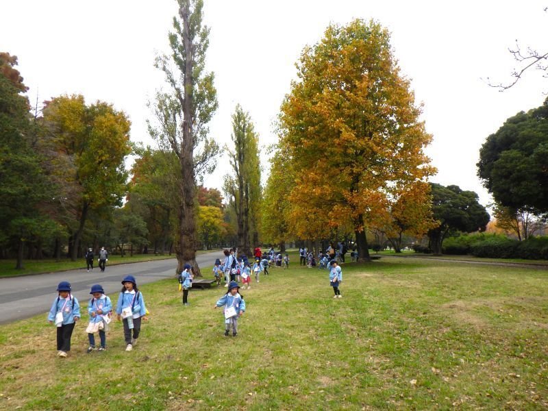 昨日11/10(月)に、満3歳児クラスつぼみ組の子ども達が、秋を自然に親しむ活動として、水元公園へやって来ました。短い時間でしたが、子ども達は色づき始めた木々見たり、見つけたお気に入りの落ち葉やドングリを集めるなどしながら、各々楽しむ様子が見られました。お弁当は芝生の上にシートを敷いて、みんなで美味しくいただきました。子ども達は秋の自然を五感で感じながら、楽しい水元公園遠足になりました。