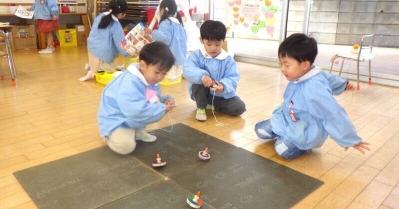 コマ回しは正月遊びとして、昔から年末年始に親しまれる遊びのひとつですね。幼稚園では学年ごとに違ったタイプのコマを用意しておりますが、各クラスでは子ども達がコマ回しを楽しんでいる姿が見られます。写真は年中児がコマ回しをして遊んでいる様子ですが、年中組のコマは軸に巻き付けた紐を引っ張って回すタイプのコマです。紐を使って回すコマは、紐を巻くための手先の動きが必要になりますので、遊びながら手指を動かす経験になりますね。また、友達と一緒に回し方を工夫したり、教え合ったり、コマ回し対決をするなど、友だちとやり取りをしながら、様々な関わりの機会にもなります。