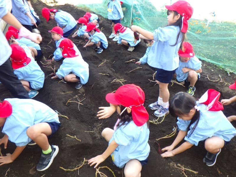 11/14(金)青鳩農園のサツマイモが収穫の時期を迎え、年長組の子ども達がサツマイモ掘りを行いました。大小さまざまなサツマイモを見つけては、その感触や重さを感じるなどして、友だちや先生とサツマイモ掘りを楽しみました。こうした収穫体験では、サツマイモが出来る環境や、どのようにサツマイモを収穫するのかといったことを子ども達が知る機会にもなりますね。収穫したサツマイモはふかし芋や焼きいもにして食べてみたり、造形遊びの材料にするなどして、保育に活用していきたいと考えています。