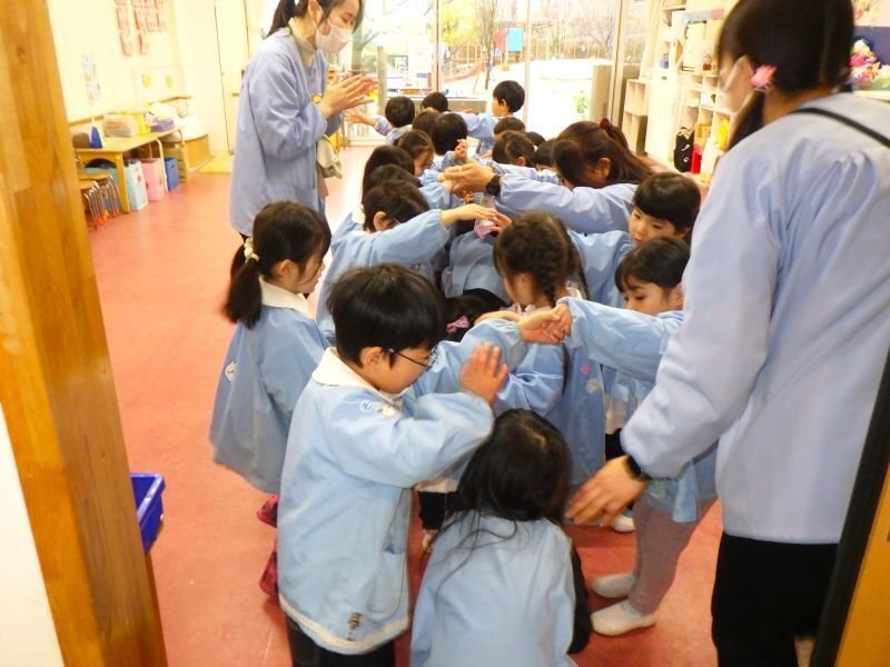 今日は午前保育でしたが、年少組と満3歳児クラスつぼみ組では、子ども達が交流する時間を設けていました。つぼみ組の子ども達が年少組へ行って一緒に関わりましたが、年少児は自分より年下の子ども達へ優しく接する姿が見られました。日頃の「クラスみんなの時間」では、学年ごとに保育を進めていますが、こうした縦割りでの保育も双方にとって有意義なことだと思います。今回も年少児にとりましては、自分たちがお兄さんお姉さんになる自覚の気持ち等を持つと共に、つぼみ組の子ども達にとりましても、色々な面で進級後の見通しの機会に繋がったことと思います。