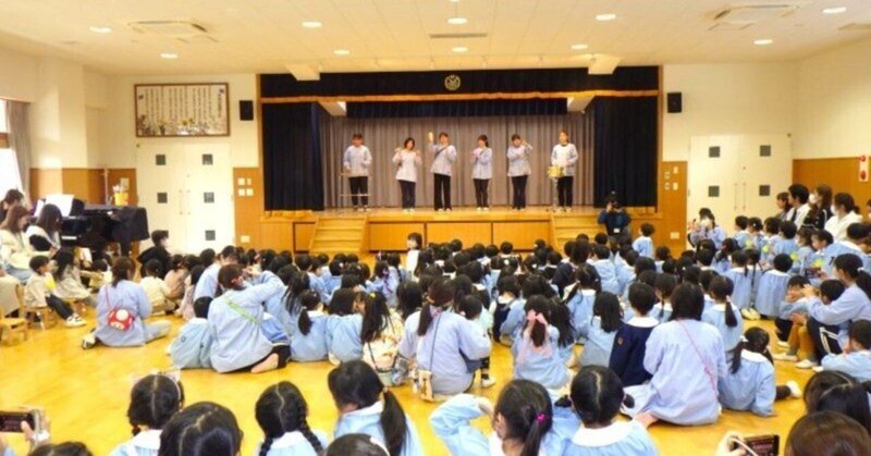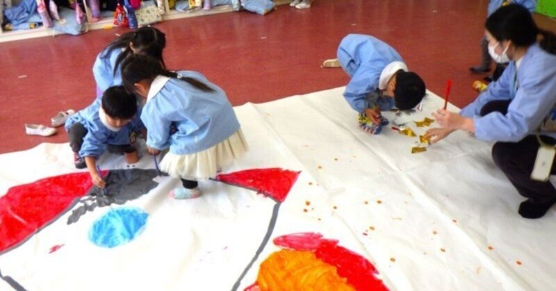 年少ありんこ組を覗くと、自分たちがおゆうぎを発表する背景画の色を塗っている子ども達の姿がありました。先生と一緒に、ちぎった折り紙を貼っている子ども達もいます。おゆうぎ会は表現領域の活動になりますが、振り付けやセリフを言う、歌をうたうといった身体的な表現だけでなく、こうした造形的な表現も大切にしたいと考えています。背景画だけでなく、子ども達が使う道具類や衣装などにも、子ども達の感性が感じられるとよいですね。こうしたことを友達や先生と協力しながら作り上げていくことで、おゆうぎ会へ向けた子ども達の意欲を高めると共に、おゆうぎ会が総合的な表現の発表の機会になっていくと思います。