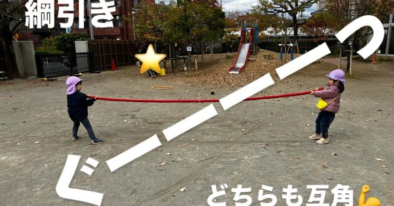 はじめは2人で両サイドの綱を引いて互角の戦いでしたが…